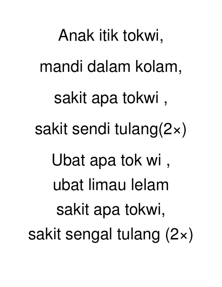 Download the app to get started. Download the app to get started. Now we recommend you to download first result lagu kanak kanak melayu malaysia anak itik tok wi mp3. Anak itik tok wi mandi dalam kolam sakit apa tok wi sakit sendi tulang ubat apa tok wi ubat limau lelam sakit apa tok wi sakit. Angkara siti nordiana lirik ost angkara cinta.