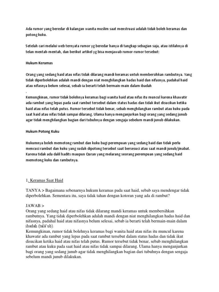 Jika dikerjakan tidak mendapat dosa. Apakah benar ada larangan memotong rambut dan kuku ketika haid? Hadis ini menunjukkan bahwa rambut rontok atau potong kuku ketika haid hukumnya sama dengan kondisi suci. Membahas masalah mengenai potong kuku atau rambut saat sedang haid, memang tidak terdapat riwayat yang menuliskan jika memotong kuku pada saat haid dilarang. Adapun yang wajib dicuci setelah haid apa yang diceritakan dari 'atha maknanya ialah bahwasanya orang junub tidak dimakruhkan memotong rambut dan kukunya ketika dia junub. Pemahaman tentang hukum potong kuku atau rambut saat haid sampai saat ini masih menjadi tanda tanya bagi kebanyakan perempuan. Bagaimana syariat memandang perkara tersebut dan bagaimana hukumnya? Dari mana sumber hukum larangan ini? Keraguan ini boleh menjurus sehingga wanita lebih rela menyimpan kuku yang panjang atas alasan. Antara kekeliruan ramai wanita hingga ke hari ini adalah berkaitan larangan memotong kuku, rambut atau bercukur ketika haid atau nifas. Dengan tidak memotongnya, akan lebih mudah penyakit bersarang di situ. Apakah ada ulama yang membahas ini dalam kitab fikih mazhab? Lalu, bolehkah ia memotong kuku saat haid?
