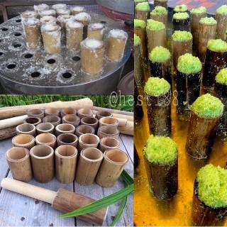 The cake is made of rice flour called suji and coloured green with extract acquired from pandan leaf, filled with palm sugar, and steamed in bamboo tubes, hence its name.